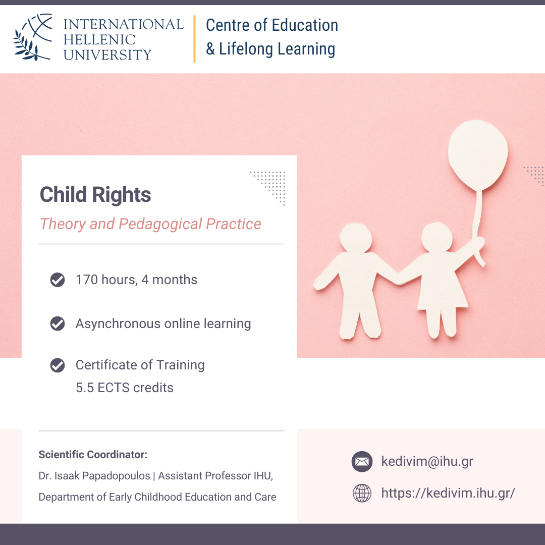 The program aspires to contribute to the shaping of a school environment that promotes respect, equality, democracy, and participation, empowering educators to become pedagogues who recognize the child as a rights-bearing individual and an active participant in the learning process.