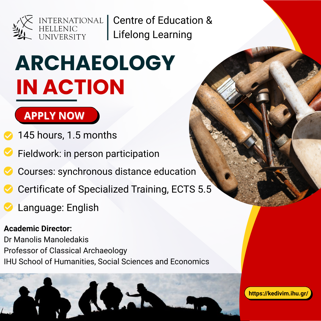 The Lifelong learning programme “Archaeology in Action”, offered by the International Hellenic University (Thessaloniki), is addressed to people who are interested in archaeology and especially excavation. It combines online lectures with hands-on experience in archaeological fieldwork and laboratory practice. Participants are introduced to all stages of archaeological research, through the ongoing excavation of the International Hellenic University at the site “Trapeza of Neo Rysio – Kardia”, near Thessaloniki. Flexible participation modes (full-time, part-time, non-credit) allow students and enthusiasts to engage with archaeology in a dynamic and practical way, complemented by optional weekend excursions to major sites of ancient Macedonia, as well as archaeological museums, while enjoying the vibrant cultural life, seaside atmosphere, and rich history of Thessaloniki.