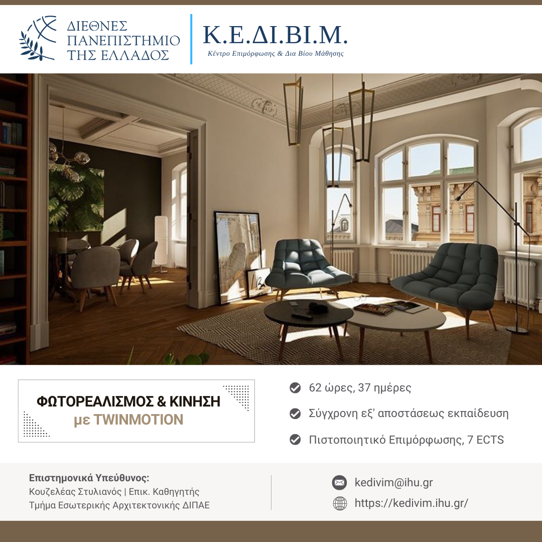 Σκοπός του προγράμματος είναι οι συμμετέχοντες να κατανοήσουν κατ’ αρχάς τις βασικές έννοιες του φωτορεαλισμού με τη χρήση του σύγχρονου λογισμικού Twinmotion (Unreal Engine). Στη συνέχεια στόχος είναι οι συμμετέχοντες να εφαρμόσουν με τρόπο απλό, πρακτικό και πλήρως κατανοητό κύριες και εξεζητημένες λειτουργίες φωτορεαλισμού που καλύπτουν όλο το φάσμα των φωτορεαλιστικών αναγκών (εισαγωγή & επεξεργασία αντικειμένων, Υλικά, περιβάλλον, κάμερα, εικόνα, βιβλιοθήκες, κοκ). Τέλος σκοπός του προγράμματος είναι οι συμμετέχοντες να μπορούν να προσαρμόσουν τον φωτορεαλισμό στη 3Δ ψηφιακή τους σχεδίαση, να χρησιμοποιούν έτοιμες τοπικές ή διαδικτυακές σύγχρονες βιβλιοθήκες και να αυξήσουν την ποιότητα της παρουσίασης των σχεδίων και συλλήψεών τους .